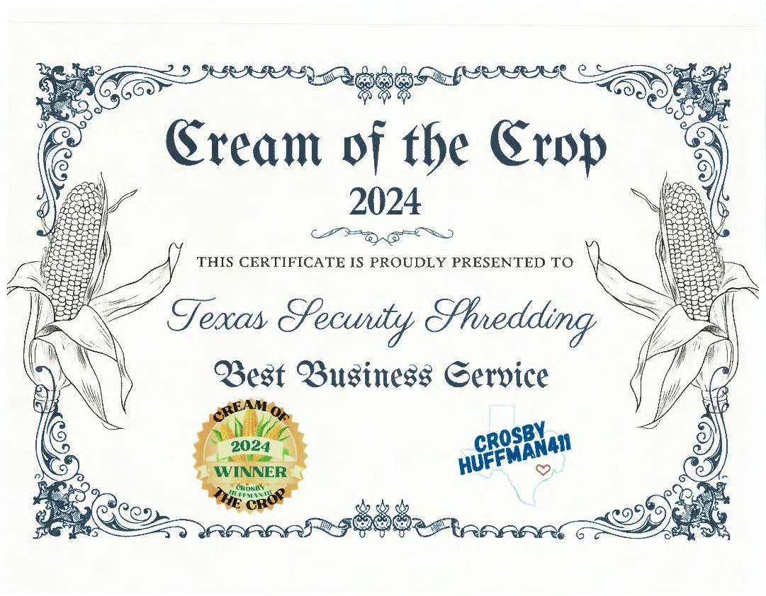 At Texas Security Shredding, we also offer electronic hard drive shredding and event day shredding services, allowing us to handle various materials beyond standard paper documents. Our purge one-time shredding services provide additional support for larger projects or community-focused shredding days, promoting secure document disposal in a responsible, accessible way. Each service we provide, from document destruction shredding to specialized shredding events, is designed with the highest security standards. Our team is dedicated to maintaining confidentiality and supporting our clients with tailored shredding solutions for every need. When it comes to secure document disposal in Crosby, TX, you can trust Texas Security Shredding. Contact us today to learn more or schedule a shredding service tailored to your specific requirements. Protect your information with us—let’s keep your data secure.